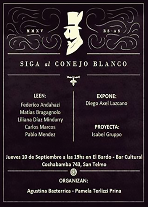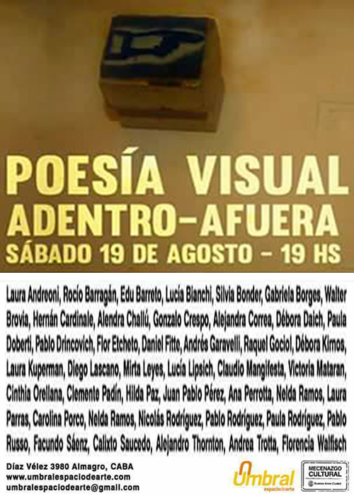 Agitar el archivo, Buenos Aires 2025II Miniprint Internacional de Río Cuarto, Córdoba 2025VI Muestra Internacional de Grabado, Esquel 2025Miniprint Galicia Internacional, Galicia 2025Miniprint Pergamino, Pergamino 2025Museo Semperé, Alte. Brown, Buenos Aires 2025Museo Semperé, Alte. Brown, Buenos Aires 2025Centro Cultural de la Cooperación, Buenos Aires 2025Centro Cultural Marcó del Pont, Buenos Aires 2025Centro Cultural de la Cooperación, Buenos Aires 2025Reus, Catalunya 2025Arlon, Belgium 2025Wingfields Barns, UK 2025Arcimboldo, Buenos Aires 2025Cadaqués, Catalunya 2025Bages, France 2024Fábrica Cultural, Don Torcuato 202444è Miniprint Cadaqués 2024Hecho de estampas - Buenos Aires 2024Wingfield Eye Suffolk, UK 202444è Miniprint Cadaqués 2024El arte de resistir - Buenos Aires 2024Resistencias Tipográficas - Buenos Aires 2024El arte de resistir - Buenos Aires 2024Resistencias Tipográficas - Buenos Aires 2024Giro Gráfico. Rumores y clamores del sur - Montevideo 2023Giro Gráfico. Rumores y clamores del sur - Montevideo 2023Giro Gráfico. Rumores y clamores del sur - Montevideo 2023Semana de las Artes - Quilmes 2023Paz-Paz y otras poéticas amigas - Quilmes 2023Huellas de Tinta - E. Ríos 20235th International Ex-libris Competition - Istanbul 2022Razón de Sortilegio, Montevideo 2022Agua en Spark Sitio de Arte y Literatura - Bs As 2022Palabra Sublevada - Pergamino 2022Grabado en vivo en la Noche de los museos - Buenos Aires 2022Agua en El Cántaro - Buenos Aires 2022La nave de los locos - Buenos Aires 2022Postales por Ayotzinapa - Madrid 2022Huellas de tinta - Necochea 2022Epistolario, diálogos con Leónidas Barletta - Buenos Aires 2022"2do Salón Internacional de Grabado Palestina Libre" - Buenos Aires Salón de Grabado - Esquel 2022Io resto a casa. Rinascita 2020Printmaking without borders 2020Proyecto Botellas - Buenos Aires 2019Ciclo - Buenos Aires 2019La eternidad imaginaria - Buenos Aires 2019Salón de otoño - San Fernando 2019Manifiesto de palabras - San Fernando 2019Octubre, mes del grabado - Buenos Aires 2019No hay derecho - Buenos Aires 2019Fin de ciclo - Buenos Aires 2019Poesía Visual y Experimental - Quilmes 2019Entredichos. Espacio Justo, Haedo - Buenos Aires. 2019Antología ¨...xyzA-Cdef...¨2019Presentación y muestra de ¨...xyzA-Cdef...¨ 2019Antología ¨...xyzA-Cdef...¨ en la Feria del Libro 2019Identidad y diversidad, Concepción del Uruguay, Entre Ríos. 2019Incontro con la poesia, Caserta, Italia. 2019Libros, San Fernando, Prov de Bs. As. 2019Inventario, Mercedes, Prov. de Buenos Aires. 2019"Museo Artemio Alisio, Entre Ríos. 2019Miniprint Luis Bourband, Entre Ríos. 2018Noche de los Museos. 201812 x 12 Octubre mes del grabado. 2018Museo Carnacini, San Martin, Prov. de Bs. As. 2018Quilmes, Prov. de Bs. As. 2018Avellaneda, Prov. de Bs. As. 2018Quilmes, Prov. de Bs. As. 2018Federación Gráfica Bonaerense, 2018MUNOGRA en El Cántaro, C.A.B.A. 2018Miniprint, Rosario, Santa Fe. 2017Museo Roverano, Quilmes, Prov. de Bs. As. 2017Espacio de Arte Umbral, C.A.B.A. 2017San Fernando, Prov. de Bs As. 2017Quilmes, Prov. de Bs. As. 2017San Pedro, Cholula Puebla, México. 2017El Bardo, C.A.B.A. 2016El Bardo, C.A.B.A. 2015MACBA, C.A.B.A. 2015MACBA, C.A.B.A. 2015Köflach, Österreich. 2014Biblioteca del Congreso de la Nación. C.A.B.A. 2013Biblioteca del Congreso de la Nación. C.A.B.A. 2013Haedo, Prov. de Bs. As. 2012