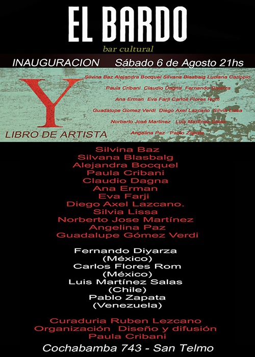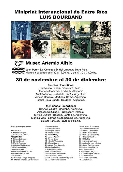 Agitar el archivo, Buenos Aires 2025II Miniprint Internacional de Río Cuarto, Córdoba 2025VI Muestra Internacional de Grabado, Esquel 2025Miniprint Galicia Internacional, Galicia 2025Miniprint Pergamino, Pergamino 2025Museo Semperé, Alte. Brown, Buenos Aires 2025Museo Semperé, Alte. Brown, Buenos Aires 2025Centro Cultural de la Cooperación, Buenos Aires 2025Centro Cultural Marcó del Pont, Buenos Aires 2025Centro Cultural de la Cooperación, Buenos Aires 2025Reus, Catalunya 2025Arlon, Belgium 2025Wingfields Barns, UK 2025Arcimboldo, Buenos Aires 2025Cadaqués, Catalunya 2025Bages, France 2024Fábrica Cultural, Don Torcuato 202444è Miniprint Cadaqués 2024Hecho de estampas - Buenos Aires 2024Wingfield Eye Suffolk, UK 202444è Miniprint Cadaqués 2024El arte de resistir - Buenos Aires 2024Resistencias Tipográficas - Buenos Aires 2024El arte de resistir - Buenos Aires 2024Resistencias Tipográficas - Buenos Aires 2024Giro Gráfico. Rumores y clamores del sur - Montevideo 2023Giro Gráfico. Rumores y clamores del sur - Montevideo 2023Giro Gráfico. Rumores y clamores del sur - Montevideo 2023Semana de las Artes - Quilmes 2023Paz-Paz y otras poéticas amigas - Quilmes 2023Huellas de Tinta - E. Ríos 20235th International Ex-libris Competition - Istanbul 2022Razón de Sortilegio, Montevideo 2022Agua en Spark Sitio de Arte y Literatura - Bs As 2022Palabra Sublevada - Pergamino 2022Grabado en vivo en la Noche de los museos - Buenos Aires 2022Agua en El Cántaro - Buenos Aires 2022La nave de los locos - Buenos Aires 2022Postales por Ayotzinapa - Madrid 2022Huellas de tinta - Necochea 2022Epistolario, diálogos con Leónidas Barletta - Buenos Aires 2022"2do Salón Internacional de Grabado Palestina Libre" - Buenos Aires Salón de Grabado - Esquel 2022Io resto a casa. Rinascita 2020Printmaking without borders 2020Proyecto Botellas - Buenos Aires 2019Ciclo - Buenos Aires 2019La eternidad imaginaria - Buenos Aires 2019Salón de otoño - San Fernando 2019Manifiesto de palabras - San Fernando 2019Octubre, mes del grabado - Buenos Aires 2019No hay derecho - Buenos Aires 2019Fin de ciclo - Buenos Aires 2019Poesía Visual y Experimental - Quilmes 2019Entredichos. Espacio Justo, Haedo - Buenos Aires. 2019Antología ¨...xyzA-Cdef...¨2019Presentación y muestra de ¨...xyzA-Cdef...¨ 2019Antología ¨...xyzA-Cdef...¨ en la Feria del Libro 2019Identidad y diversidad, Concepción del Uruguay, Entre Ríos. 2019Incontro con la poesia, Caserta, Italia. 2019Libros, San Fernando, Prov de Bs. As. 2019Inventario, Mercedes, Prov. de Buenos Aires. 2019"Museo Artemio Alisio, Entre Ríos. 2019Miniprint Luis Bourband, Entre Ríos. 2018Noche de los Museos. 201812 x 12 Octubre mes del grabado. 2018Museo Carnacini, San Martin, Prov. de Bs. As. 2018Quilmes, Prov. de Bs. As. 2018Avellaneda, Prov. de Bs. As. 2018Quilmes, Prov. de Bs. As. 2018Federación Gráfica Bonaerense, 2018MUNOGRA en El Cántaro, C.A.B.A. 2018Miniprint, Rosario, Santa Fe. 2017Museo Roverano, Quilmes, Prov. de Bs. As. 2017Espacio de Arte Umbral, C.A.B.A. 2017San Fernando, Prov. de Bs As. 2017Quilmes, Prov. de Bs. As. 2017San Pedro, Cholula Puebla, México. 2017El Bardo, C.A.B.A. 2016El Bardo, C.A.B.A. 2015MACBA, C.A.B.A. 2015MACBA, C.A.B.A. 2015Köflach, Österreich. 2014Biblioteca del Congreso de la Nación. C.A.B.A. 2013Biblioteca del Congreso de la Nación. C.A.B.A. 2013Haedo, Prov. de Bs. As. 2012